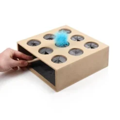 Die neue interaktive Spielbox mit extra großen Löchern ist ideal für Katzen aller Art. Die Spielbox ist aus stabilem, ungiftigen und umweltfreundlichen Holz gefertigt und bietet durch die qualitative Verarbeitung langen Spielspaß. Durch bewegen des mitgelieferten Spielstabs in der Box wird der Jagdinstinkt Ihres Stubentigers geweckt und gefördert. Die verschiedenen Einfräsungen der Löcher sorgen für ausreichend Abwechslung. Auf der einen Seite ist ein Pfotenmotiv eingefräst, auf der anderen wird es spannend mit neun eingefrästen Schlupflöchern. Der Spielstab ist mit einer Plüschmaus mit Federschwanz versehen und regt den Spieltrieb an.