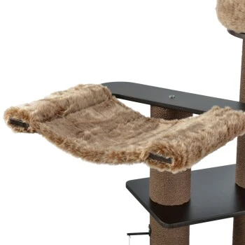 Der MORE Kratzbaum Harry ist schon auf den ersten Blick ein echter Hingucker: auf fünf verschiedenen Ebenen verteilen sich vielfältige Liegemöglichkeiten und laden somit zum ausgiebigen Klettern und Erkunden ein. Sowohl die Liegekissen als auch die integrierte Hängematte sind aus luxuriösem kuschelweichem Plüschstoff gefertigt und bieten dadurch ideale Möglichkeiten zum Beobachten und Entspannen. Bei Bedarf lassen sich die Kissen auch ganz leicht abnehmen und per Hand waschen. Die ca. 15cm breiten Kratzstämme sind mit robustem dunkelbraunem Seil ummantelt, was dem Kratzbaum seine elegante Optik verleiht. Die Bodenplatte des Kratzbaums ist mit kleinen Gummifüßen ausgestattet und schützt so den Boden. Die eleganten dunkelbraunen Farbtöne und die qualitativ hochwertige Verarbeitung machen diesen Kratzbaum zu einem langfristigen Lieblingsstück von dir und deinem Stubentiger – dank der vielfältigen Möglichkeiten zum Spielen, Kratzen, Entspannen und Beobachten.