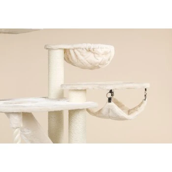 Ein großer Lounge Liegeplatz ganz oben mit der Größe von 60cm breit x 43cm tief x 15cm hoch mit einem herausnehmbaren Kissen von 3-4cm dick. Das Kissen ist mit Klettverschluss befestigt, um sicherzustellen, dass es dort bleibt, wo es ist, wenn Ihre Katze schläft oder spielt.