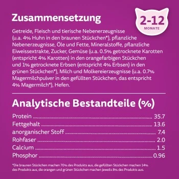Whiskas versteht, was Ihre Katze von Natur aus braucht und liebt. Deshalb enthält Whiskas 2-12 Monate alle, für die gesunde Entwicklung Ihres Kätzchens notwendigen Nährstoffe. Leckere, mit Milch gefüllte Knackits, welche Ihr Kätzchen lieben wird und leicht beißen kann.